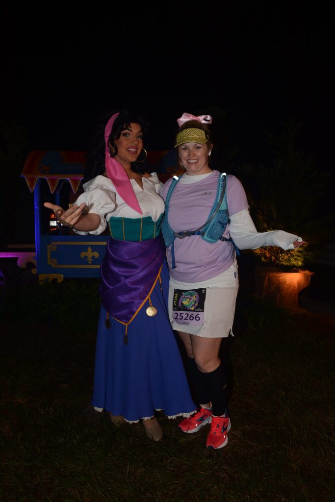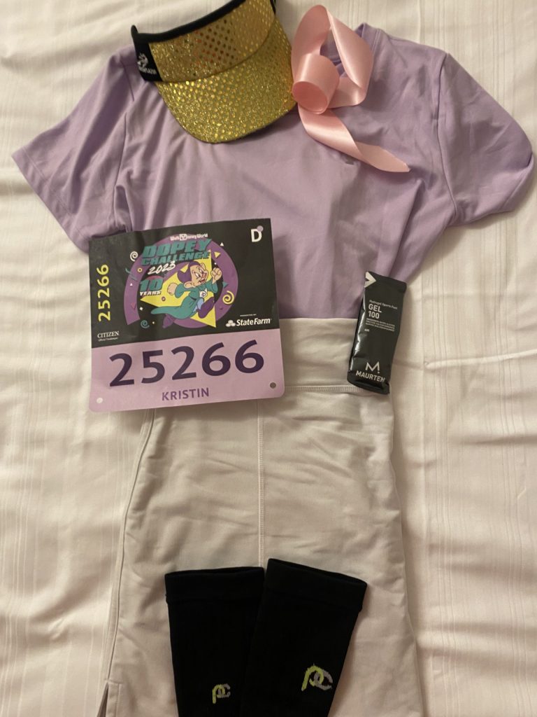 Like the other days, I laid out all of my clothes the night before to make the day easier. For this race, I was dressed like Daisy Duck. It was cold out, so I’m happy I decided to buy the runDisney spirit jersey at the expo. Since it was a long-sleeve white shirt, I decided to wear that under my purple top. Even though I don’t like cold weather, I would rather it be on the colder side for this race.
