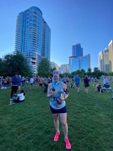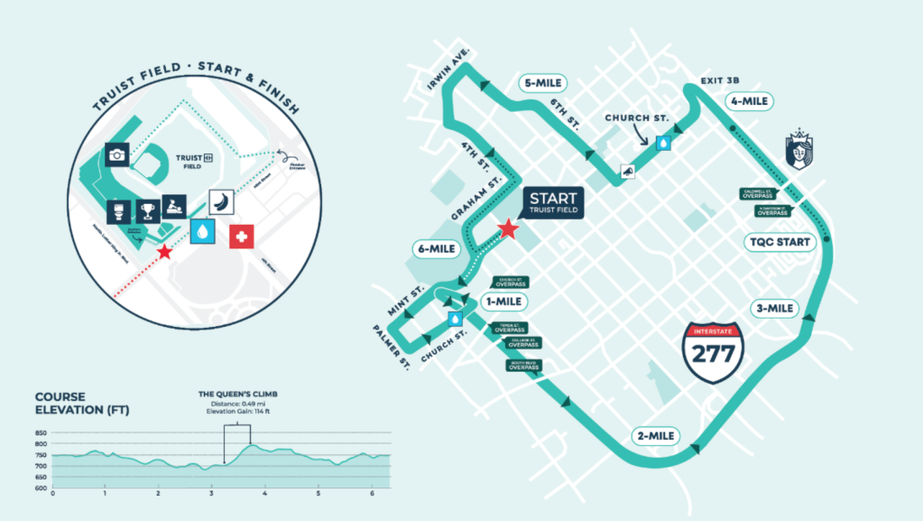 Since the race starts at Truist Stadium (where the Charlotte Knight’s play baseball), the stadium lets everyone use the restrooms, which is so nice! The city was also lit up in the ATC10K colors – this team does branding so well!